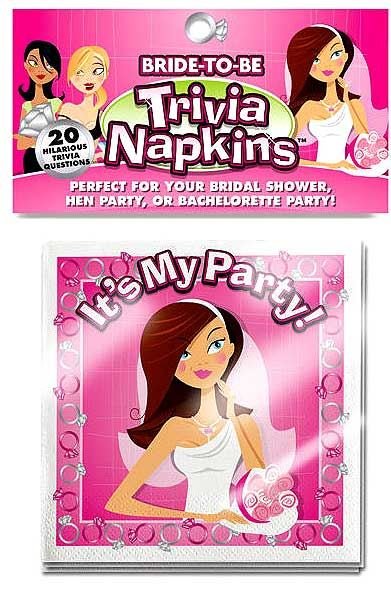 A fun trivia game about the Bride-to-Be and a napkin all in one! These napkins have 20 fun trivia questions about the bride: test the knowledge of the party attendees! The napkins are a great addition to a bachelorette party or a bridal shower.