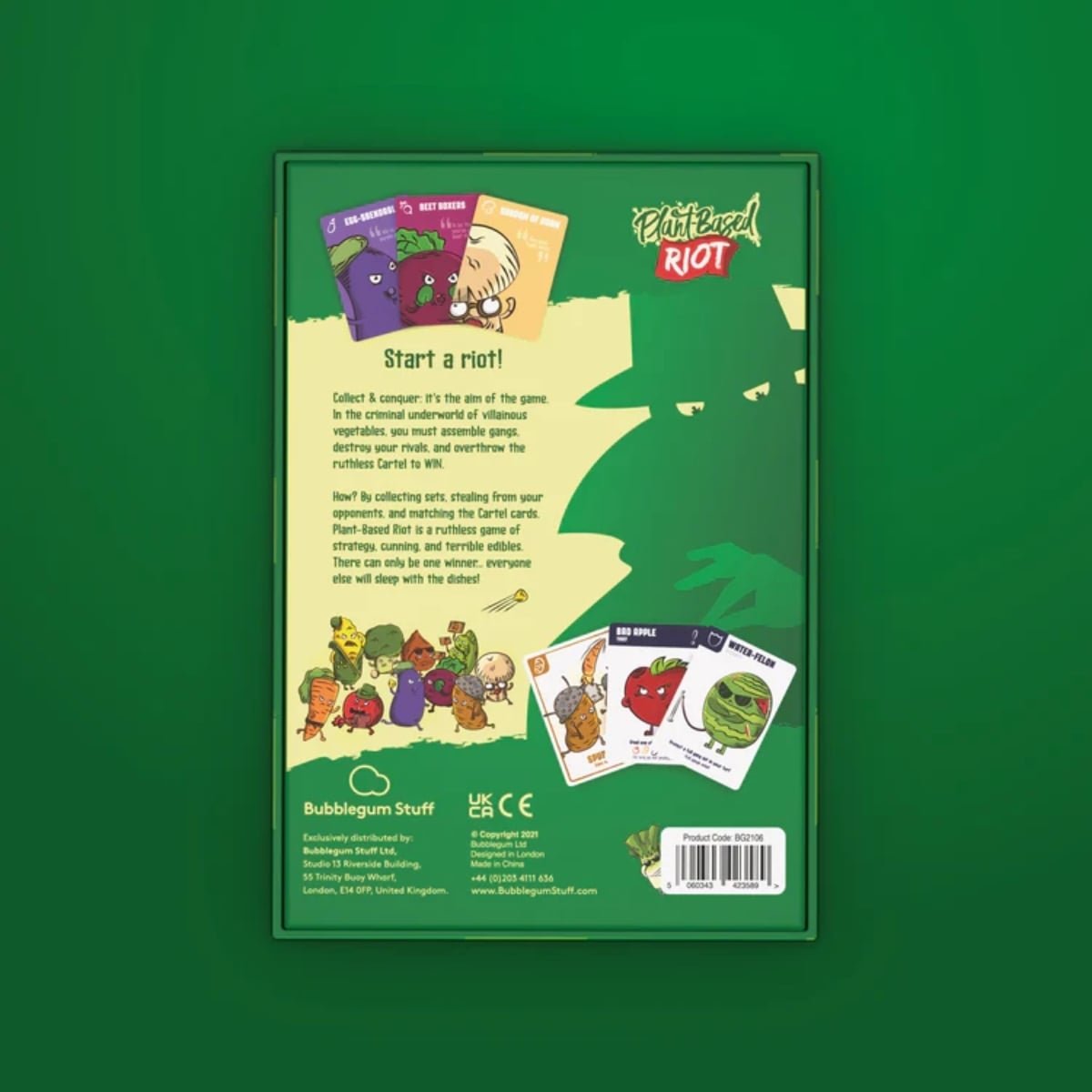 Plant-Based Riot is the set-collecting card-matching card game for families. There are gangs of terrible edibles there’s thieving fruit and there’s tons of card-based carnage. For a simple card game this baby really packs a punch.It has all the brutality of an actual food fight only with way less clearing up afterward.So how do you play?First you’ve gotta work out what villainous vegetable gangs you’ve got to collect. After that it’s all about assembling those gangs whilst simultaneously screwing over your opponents – you do that by stealing from them using action cards.Once you’ve got your veggie gangs you can start a turf war with the Cartel – that’s where you find out if you’ve collected the right gangs. If you have you win!It’s fun and fluid but also an easy card game to play so it’s perfect for your next family games night. It’s even small enough to take on your next holiday!So treat your family to a copy of this savage food-fighting card game. And shipping is free so you’d be pota-totally crazy not to!