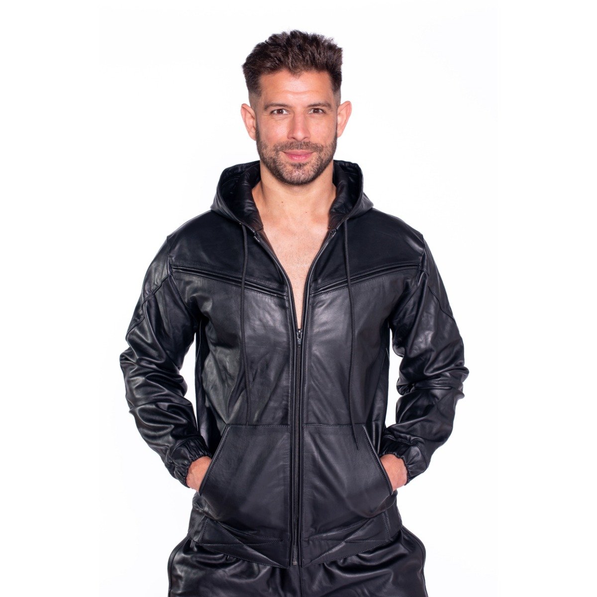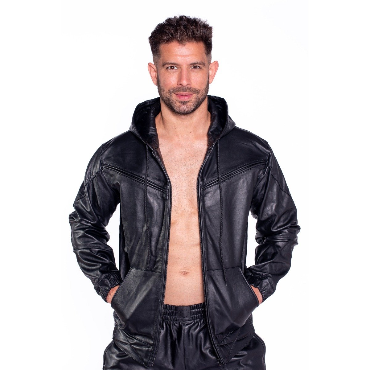 Introducing the V Racer Sports Jacket from Prowler RED—a classic hooded jacket crafted from sumptuous soft leather. This jacket seamlessly combines effortless style with the black leather fetish aesthetic making it a standout piece in your wardrobe.The V Racer Sports Jacket features a sleek design with a drawstring hood adding a touch of versatility and practicality. Its two pockets not only enhance its functionality but also contribute to its overall aesthetic appeal.Made with attention to detail and a commitment to quality this jacket embodies the perfect fusion of style and comfort. The supple leather material not only feels luxurious against the skin but also exudes a sense of allure and sophistication.Whether you’re looking to make a fashion statement or embrace the black leather fetish look the V Racer Sports Jacket from Prowler RED is the perfect choice. *shorts sold separately
