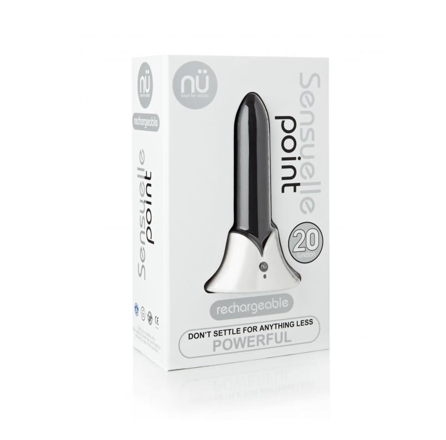 SENSUELLE POINT 20 FUNCTION – BLACKMeet the Point – the NU generation of bullet vibrators. Don’t let its innocent looks fool you this is no ordinary bullet.Hidden beneath its silky smooth twice-dipped silicone exterior you’ll find the heart soul and brains that make The Point so special. Let’s start with intuitive controls that put you in command of 20 uniquely satisfying vibration patterns. Then there’s the long-lasting rechargeable battery that powers the star of the show: Massive. Vibration. Generation. Our proprietary motor design delivers MIND BLOWING vibrations uniformly across the full surface of the toy. This means you’ll enjoy The Point’s sensational stimulation in any position.Of course The Point is 100% body safe 100% waterproof and backed by our comprehensive 1-year warranty. Includes a sturdy charging stand and USB cable.Features:Mind Blowing Power!20 Vibration PatternsVariable Speed100% Body Safe Silicone100% WaterproofRechargeableIncludes Charging Stand1-Year Comprehensive WarrantyTechnical Specifications:Weight: 30 g/0.07 lbsLength: 9.2 cm/3.6 inchesWidth (Base): 2.3 cm/0.9 inchesWidth (Tip): 1.9 cm/0.75 inchesProp 65 compliantPhthalate FreeRoHS Approved CE Approved