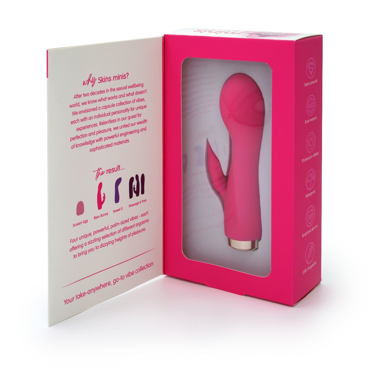 Take your vibe anywhere with the Bijou Bunny rabbit vibrator part of the adorable Skins Minis collection. With its vibrant pink colourway and teasing ears this little rabbit will never fail to bring a smile to your face.