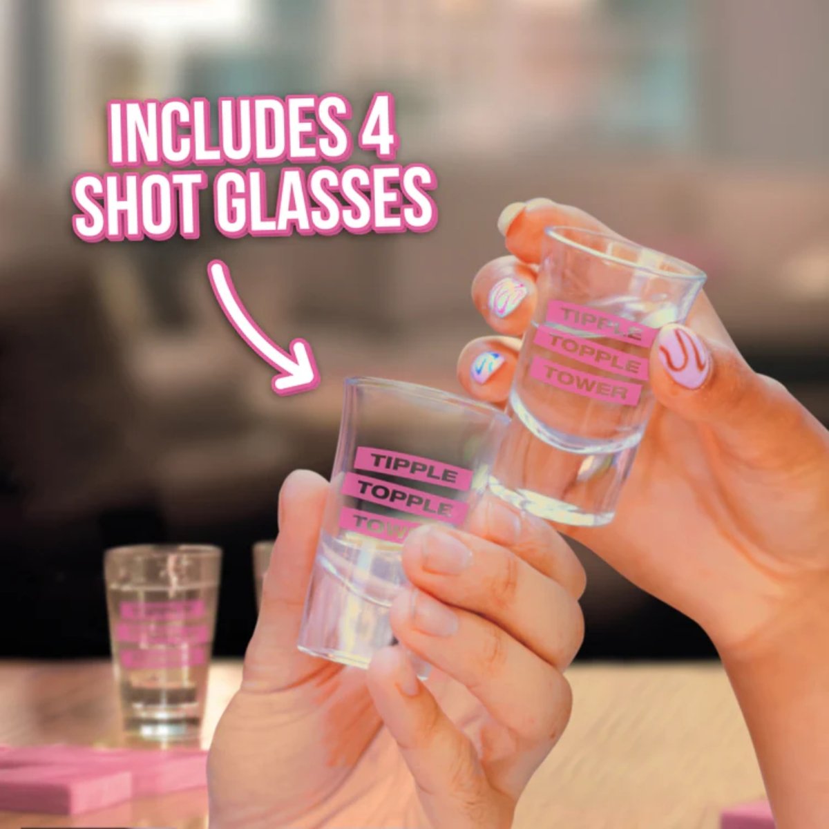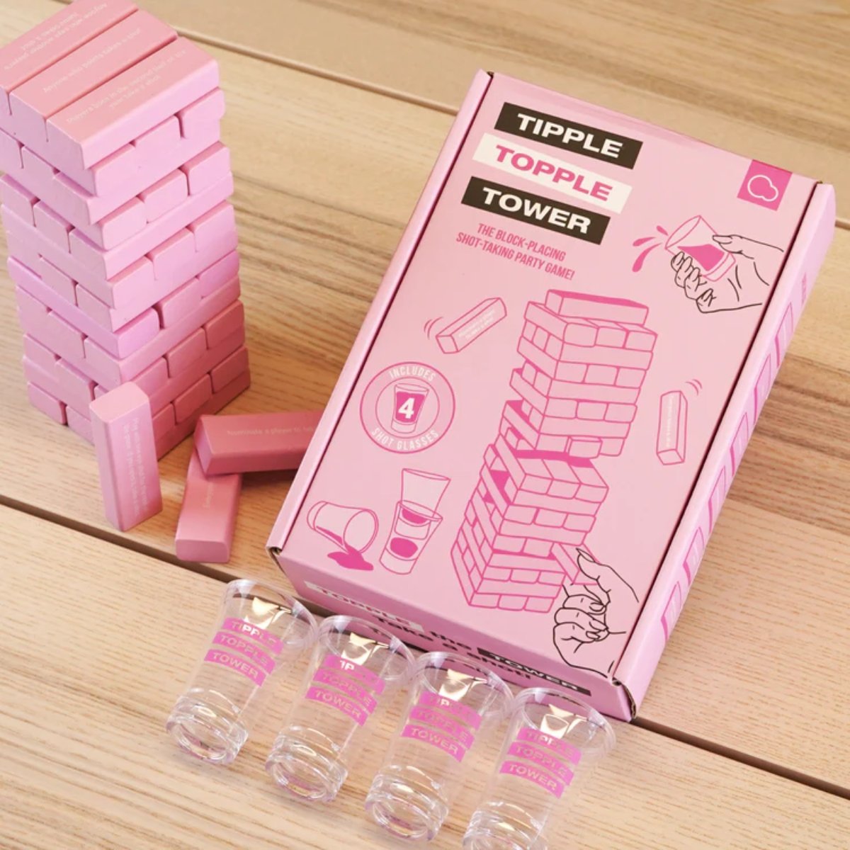 Tipple Topple Tower takes a normal boozy evening to dizzying new heights in this dare-filled block stacking and pulling game!This isn’t just any stacking game it’s a wild ride of skill strategy and outrageous challenges designed to keep your glass full.Build the tower before taking turns to remove and re-stack the blocks. Be careful! Each block may contain a wild dare that will have you hooked with anticipation!Will you successfully stack unscathed or will the dares turn your night from mild to wild in a few simple words?From sabotaging other players to playing with one eye closed will these dares see you fail?If the entire tower falls the unlucky (and probably tipsy) player must take a shot! With 4 shot glasses included no one is the designated driver in this fast-paced party game for adults!